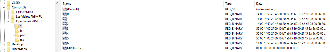 - Computer\HKEY_CURRENT_USER\SOFTWARE\Microsoft\Windows\CurrentVersion\Explorer\ComDlg32\OpenSavePidlMRU\